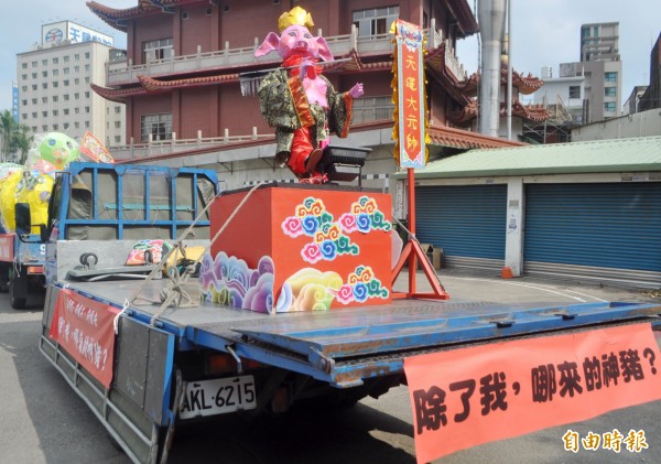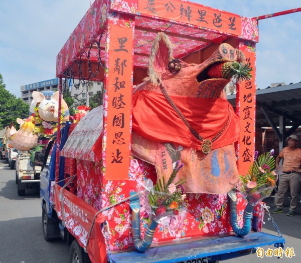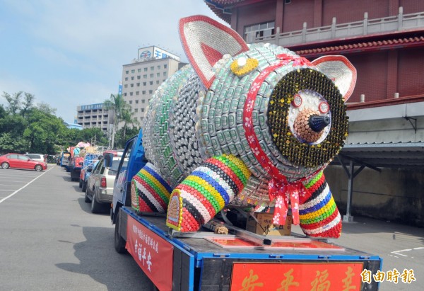 以各式資源回收物品打造的環保神豬,創意、吸睛十足。(記者李容萍攝)