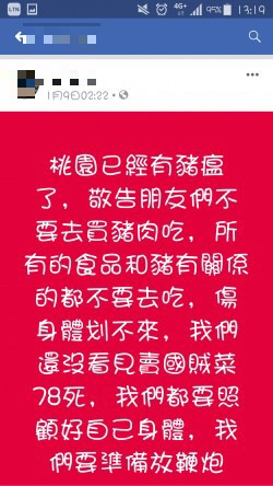 近日有網友在臉書發文聲稱,「桃園已經有豬瘟了,敬告朋友們不要去買豬肉吃」,並呼籲民眾所有的食品和豬有關的都不要去吃「傷身體划不來」,引起民眾議論。