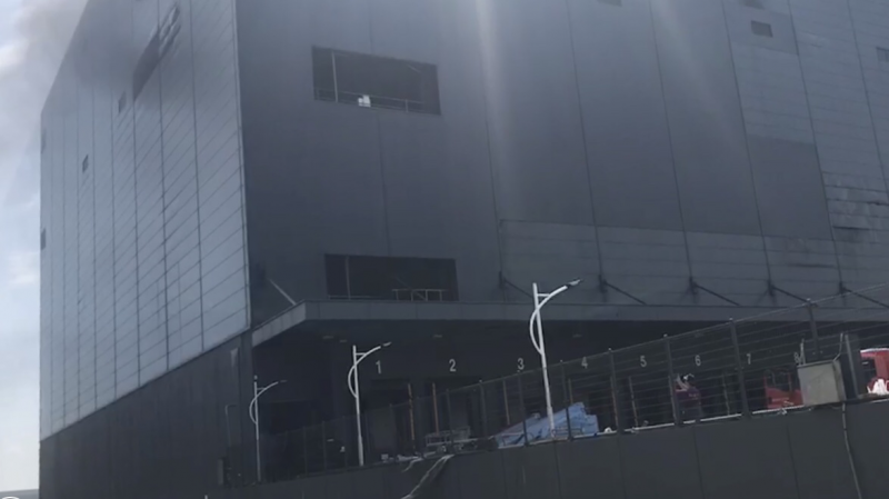 嘉里大榮物流公司桃市觀音廠,相隔不到半年,今天上午再度竄出火舌,現場冒出濃濃黑煙。(記者魏瑾筠翻攝)