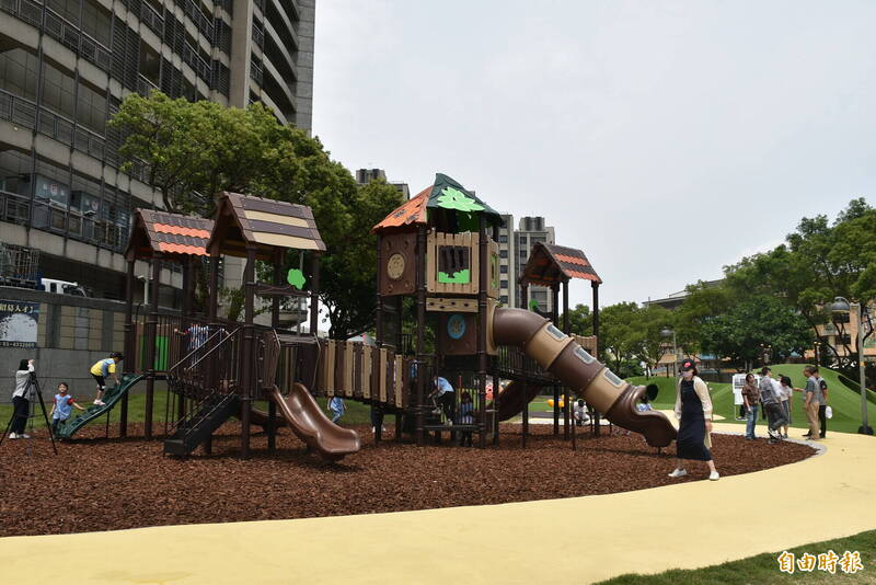 桃園市中壢星河親子公園整建,日月光捐贈樹屋造型滑梯遊具,讓小朋友玩的更開心。(記者李容萍攝)