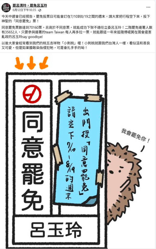 罷免桃園市國民黨立委呂玉玲團隊6月9日補件,到今未收到進一步成案消息,發言人吉媽說,中選會預告罷免投票日可能訂在7月10日到8月19日之間的週末,團隊已開始訓練街頭宣講手,希望能更清楚地表達罷免呂玉玲的訴求,面對立場不同的民眾,也能應對得體,最重要的是,告訴民眾在投票日一定要出來投下同意票。