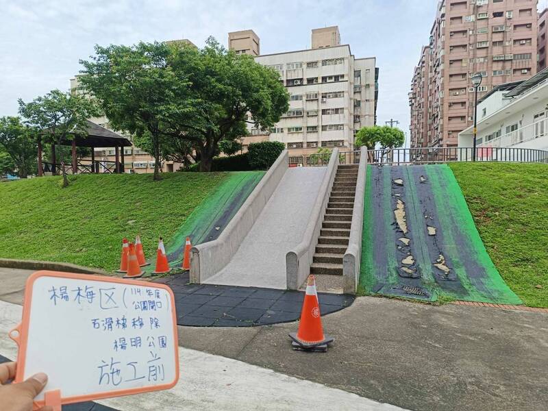 桃園市楊梅區楊明公園磨石子大溜滑梯建置已16年,不符合現行安全規範,溜滑梯下緣有落差,近期整座拆掉,在地居民直呼可惜。楊梅區公所說,將加寬階梯、增設扶手,邊坡側增設欄桿,優化遊憩動線,預計6月底前完工,公園已有滑梯組合遊具可供兒童遊玩。