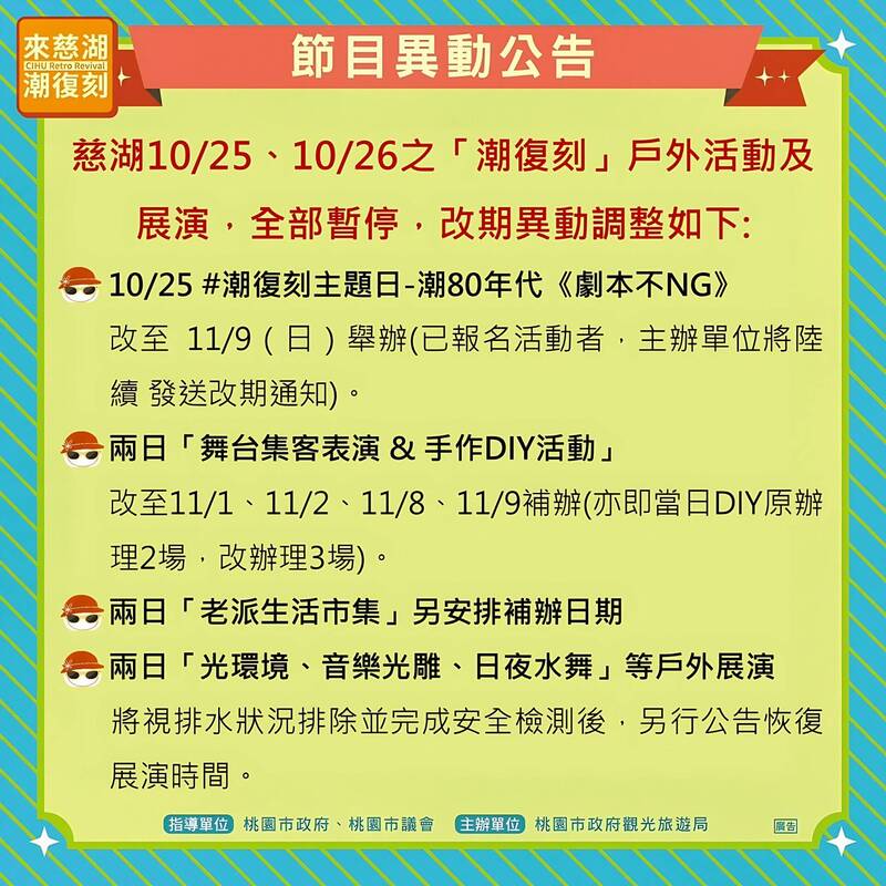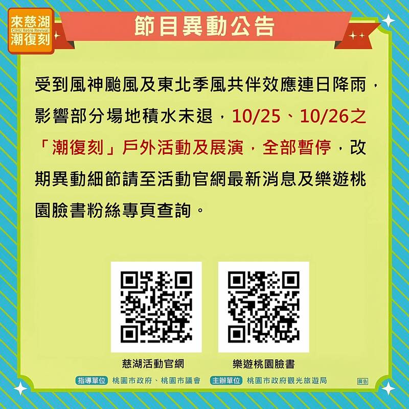 桃園市政府觀光旅遊局宣布,25日、26日的「潮復刻」戶外活動、展演都暫停。(桃園市政府提供)