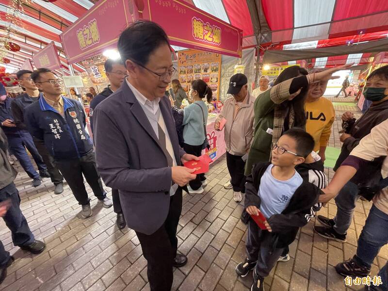 年貨大街桃園場在藝文廣場舉行,桃園市長張善政到場發放福袋。(記者謝武雄攝)