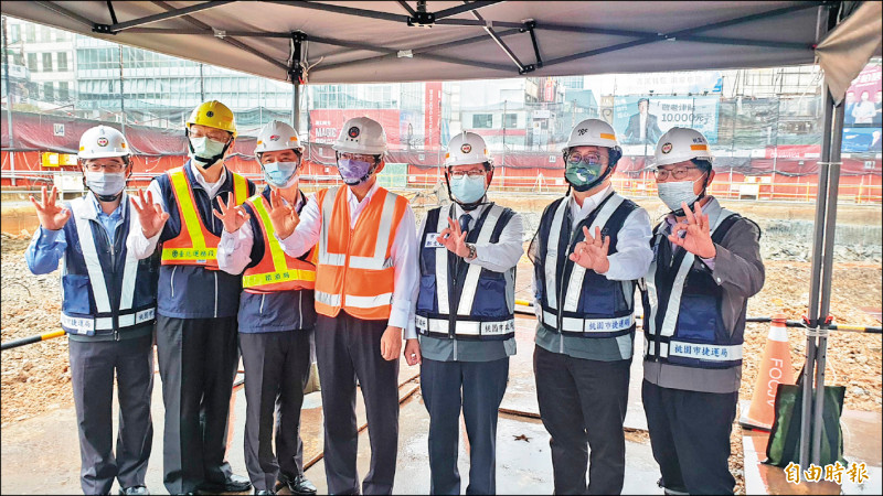 交通部長王國材(左四)、桃園市長鄭文燦(右三)視察捷運綠線G07車站工程進度。((記者謝武雄攝)