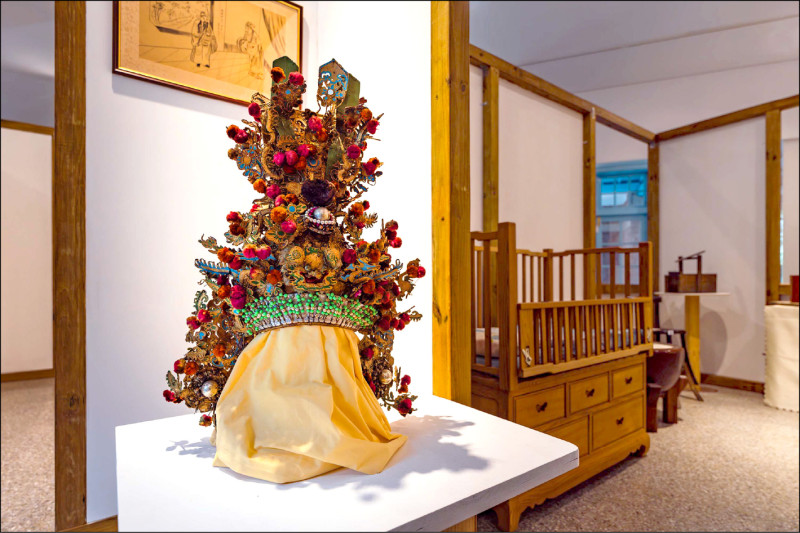 展覽也有下街四十番地工房匠師劉清剋及邱家全的作品,像邱家全為大溪社頭遶境出巡將軍全手工打造的神將頭盔,上有紅色絨球點綴,帽楣正面以串珠裝飾,上方為瑞獅,帽身兩側加上祥龍、花裝飾,造型豐富多彩。