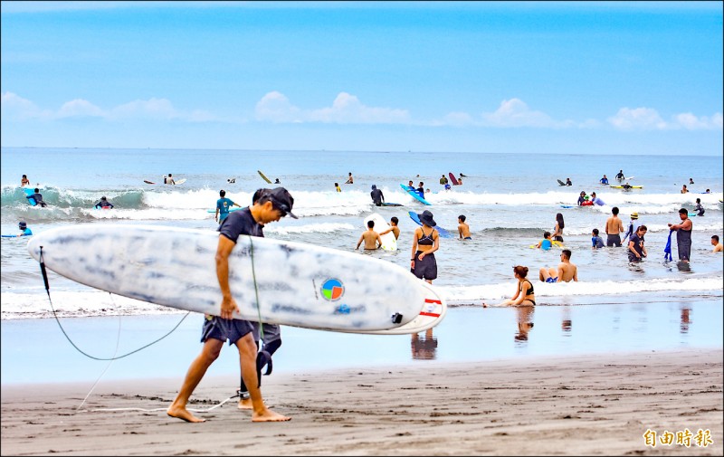 頭城鎮的外澳沙灘,是熱門的衝浪地點。(記者張議晨攝)