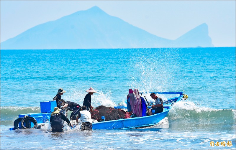 牽罟需由小船將漁網一端帶至海中拉撐,繞行後再將尾端帶回岸上。(記者張議晨攝)