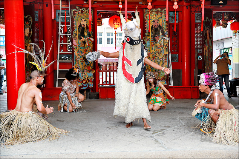 「丟丟銅蘭城國際音樂節」昨天在宜蘭市昭應宮舉行祈福儀式,邀請「曼加非洲戰鼓團」演出。(宜蘭市公所提供)