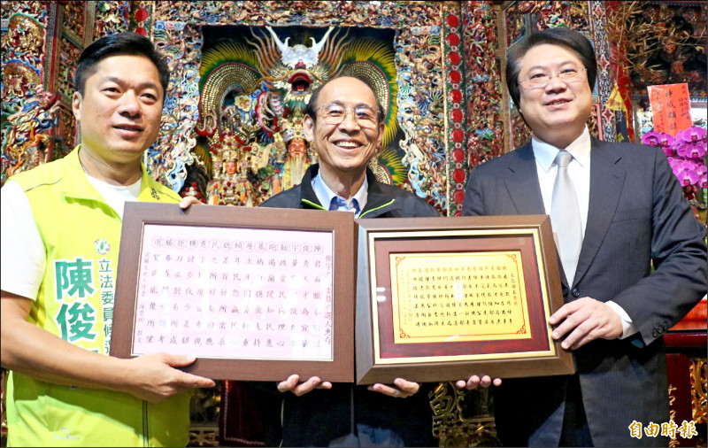 四結福德廟總幹事陳榮楷(中)作藏頭詩,分別贈內政部長林右昌(右)和宜蘭立委參選人陳俊宇(左)。 (記者蔡昀容攝)