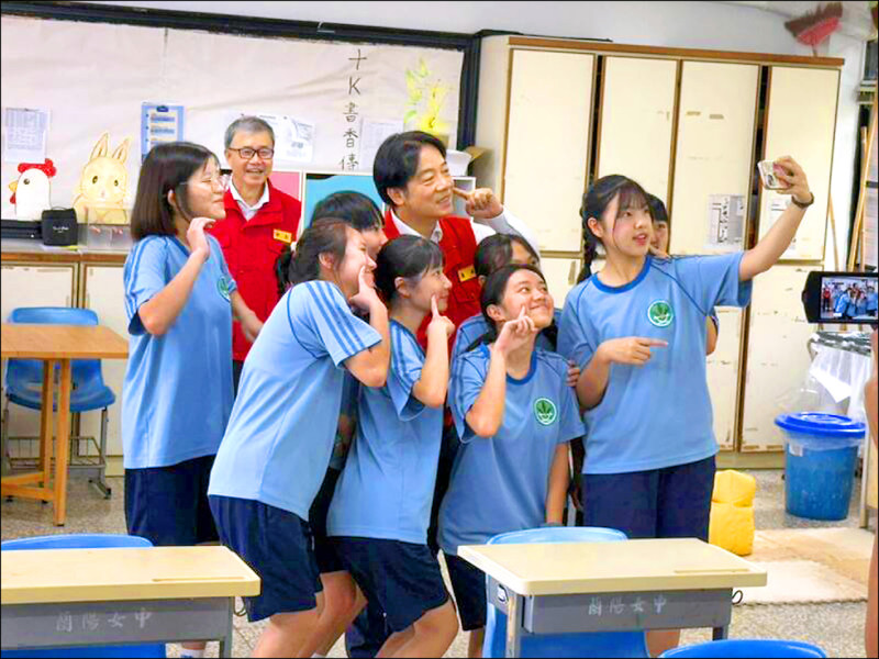 總統賴清德日前到蘭陽女中視察防災演練,女學生邀約合影,賴清德還配合擺出可愛姿勢。(民眾提供)