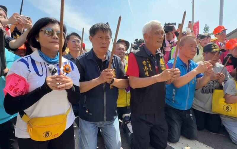 雲林縣長張麗善昨下午在彰化縣伸港福安宮牌樓前,持香下跪祈求白沙屯媽祖停駕,鑾轎最後火速往前進。(民眾提供)