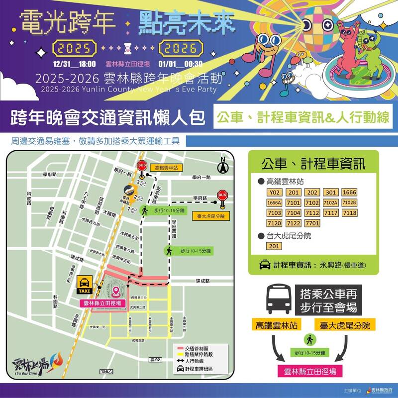 縣府指出,田徑場周邊預計湧入2萬人,永興路慢車道、建成路、永興南三街、虎興東二路、站前東路皆採取道路封閉,更嚴禁路邊停車,周邊也安排超過萬格汽機車停車位;另接駁車下午4點半至8點可搭斗六、斗南、虎尾及西螺線,返程時間則晚間10點半到凌晨1點半,每20分鐘一班,視現場人潮機動加開,民眾務必留意班次時間。