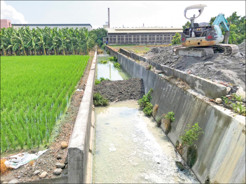 豆皮製造工廠排放污水,附近居民使出大絕招,直接用挖土機挖土堵住水流。(縣議員王又民提供)