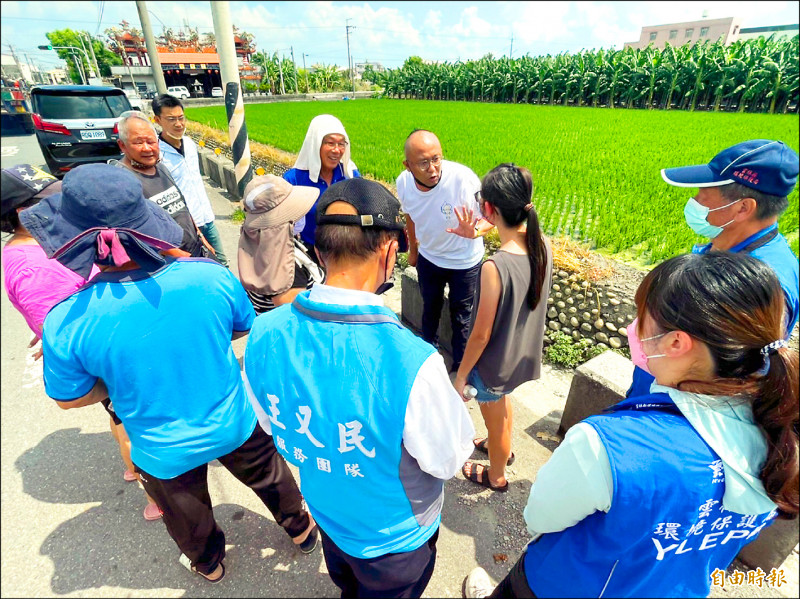 民眾聚集遭污染排水溝前,向縣議員王又民陳情。(記者鄭旭凱攝)