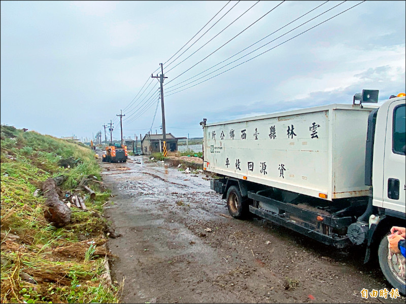 昨天一早,台西鄉風雨交加,有才寮大排出海口段整條路全被海漂垃圾封阻,充斥漂流木、瓶罐海廢,連同泥土掩蓋整條路。鄉民代表陳文求說,有才寮大排攸關上千公頃養殖區的排水,出海口一旦被漂沙封死,未來再有豪雨,內陸積水排不出去,又碰上海水漲潮,整個養殖區會很慘。