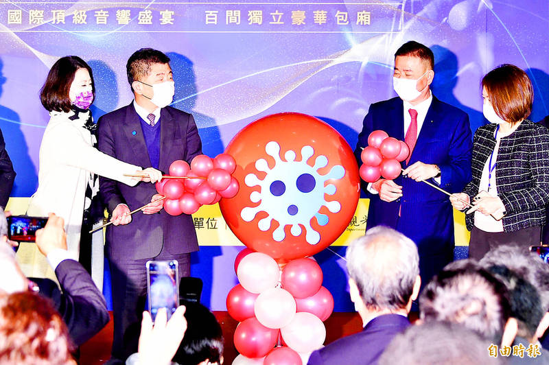 Minister of Health and Welfare Chen Shih-chung, second left, attends the launch of the 41st Taipei International Audio and Art Show in Taipei yesterday. Photo: Tu Chien-jung, Taipei Times