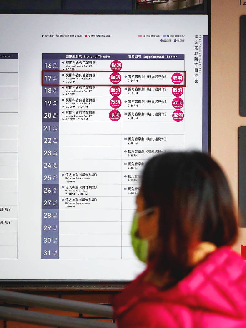 A woman looks at a schedule at the National Theater in Taipei yesterday, showing all performances of the Moscow Classical Ballet as canceled. Photo: CNA