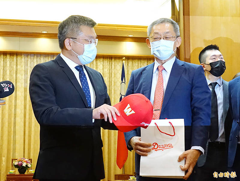 Wei Chuan Dragons chairman Hsu Wen-fang, right, on Thursday hands Deputy Legislative Speaker Tsai Chi-chang a baseball cap with the team logo as a delegation from the Chinese Professional Baseball League visited the Legislative Yuan in Taipei. Photo: Wang Yi-sung, Taipei Times