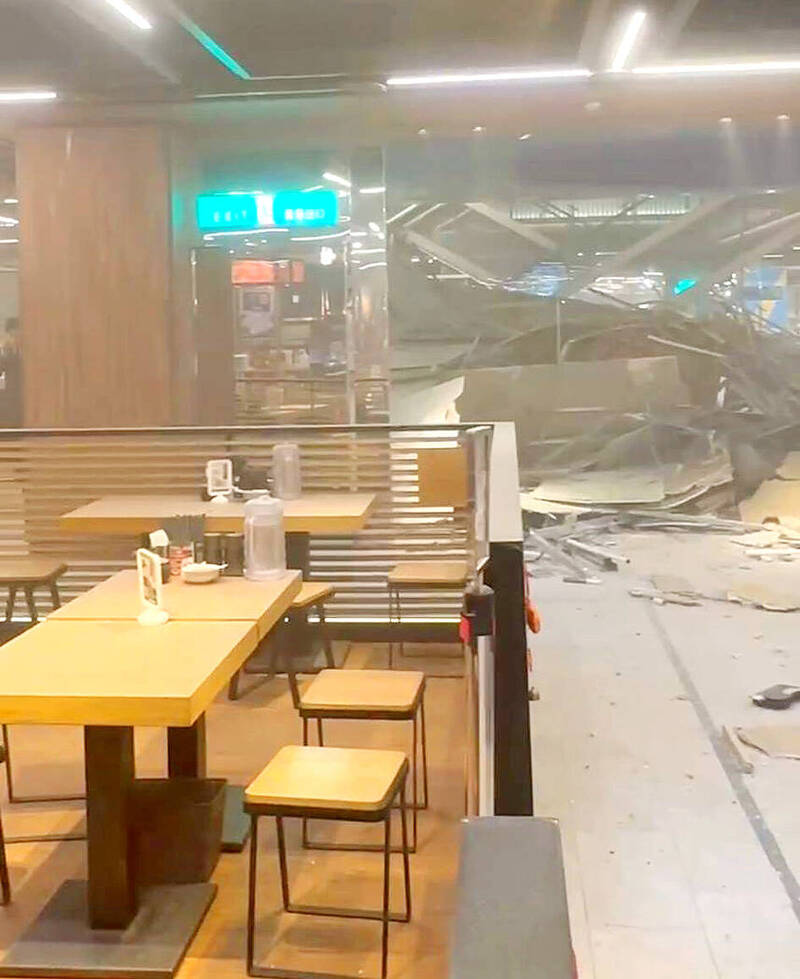 The ceiling in a dining area inside the Taichung Shin Kong Mitsukoshi department store collapses after an apparent gas explosion yesterday morning.