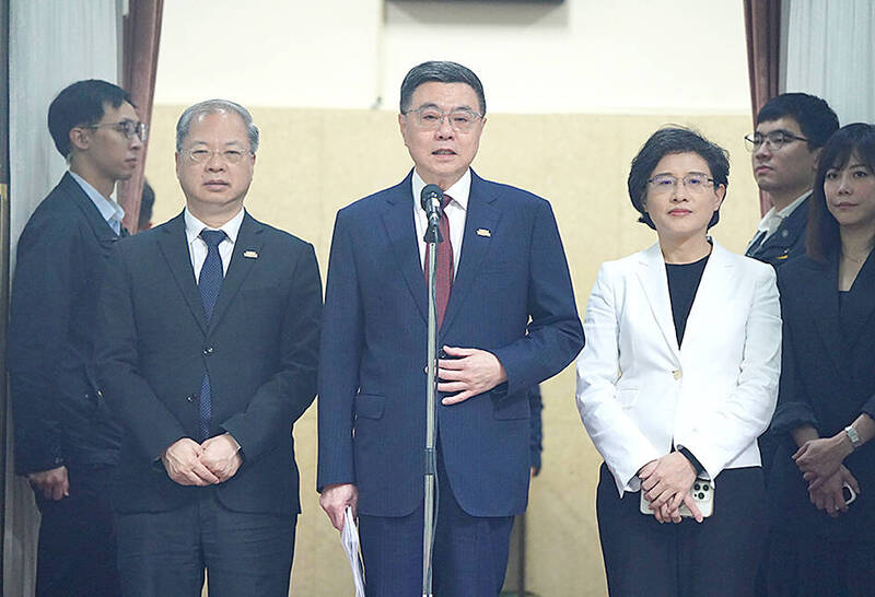 Premier Cho Jung-tai, center, speaks to the press yesterday in the legislature to iterated that TSMC’s new investment pledge in the US would help Taiwan’s industrial sector extend its global reach and create a win-win situation with Taiwan’s allies. Photo: CNA