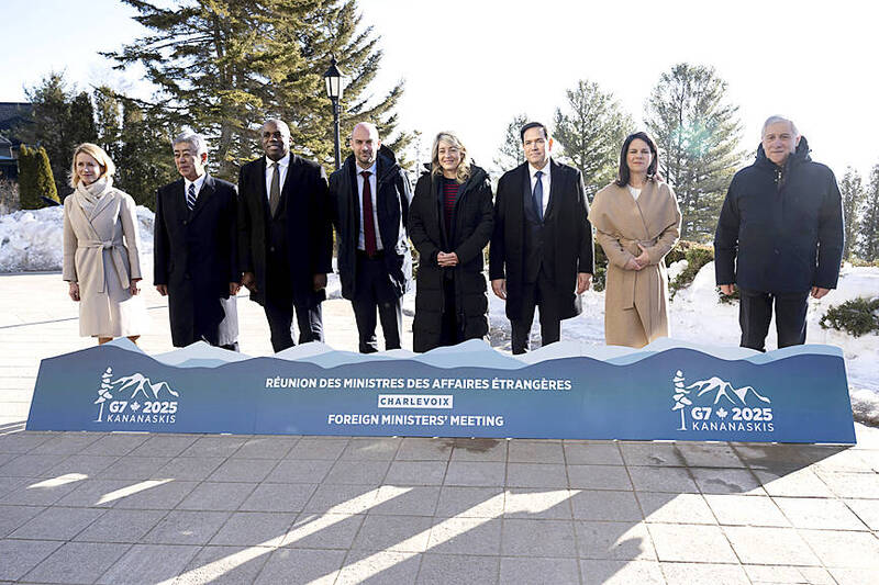 From left, EU High Representative for Foreign Affairs and Security Policy Kaja Kallas, Japanese Minister of Foreign Affairs Takeshi Iwaya, British Secretary of State for Foreign, Commonwealth and Development Affairs David Lammy, French Minister for Europe and Foreign Affairs Jean-Noel Barrot, Canadian Minister of Foreign Affairs Melanie Joly, US Secretary of State Marco Rubio, German Minister for Foreign Affairs Annalena Baerbock and Italian Minister of Foreign Affairs Antonio Tajani pose for a photo during the G7 foreign ministers’ meeting in La Malbaie, Canada, on Friday. Photo: AP