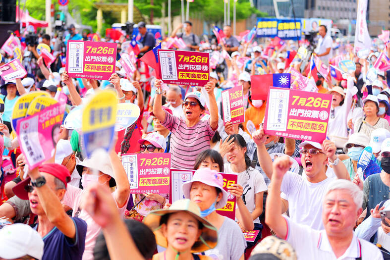 Twenty-four Chinese Nationalist Party (KMT) lawmakers and suspended Hsinchu Mayor Ann Kao (高虹安), formerly a member of the Taiwan People’s Party (TPP), face recall votes on July 26 and two KMT lawmakers face recall votes on Aug. 23.