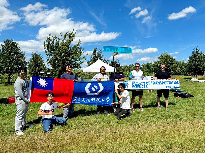 Students from National Formosa University and Czech Technical University pose with “Moonflyer” solar-powered drones they jointly developed in an undated photograph. Photo courtesy of the Ministry of Education