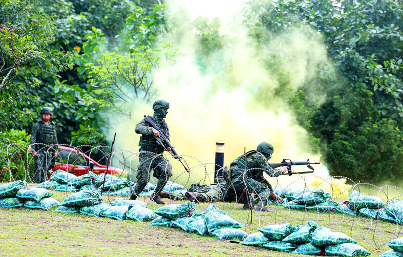 Reservists participate in a small unit combat training session at Loung Te Industrial Parks Service Center in Yilan County yesterday. Photo: I-Hwa Cheng, AFP