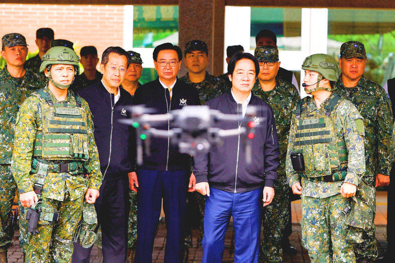 President William Lai inspects reservists operating a Taiwan-made Hummer 2 drone during a training session at Loung Te Industrial Parks Service Center in Yilan County yesterday.