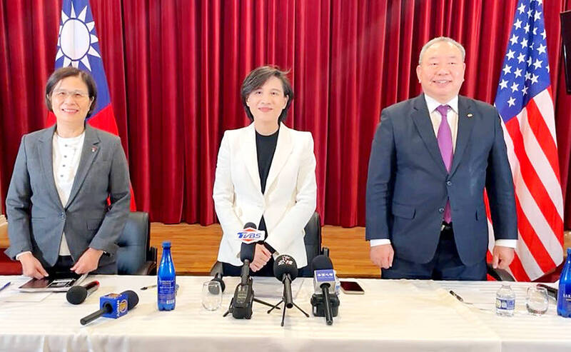 From left, Minister Without Portfolio Yang Jen-ni, Vice Premier Cheng Li-chiun and Representative to the US Alexander Yui hold a news conference in Washington on Thursday. Photo: screen grab from the Executive Yuan’s livestream