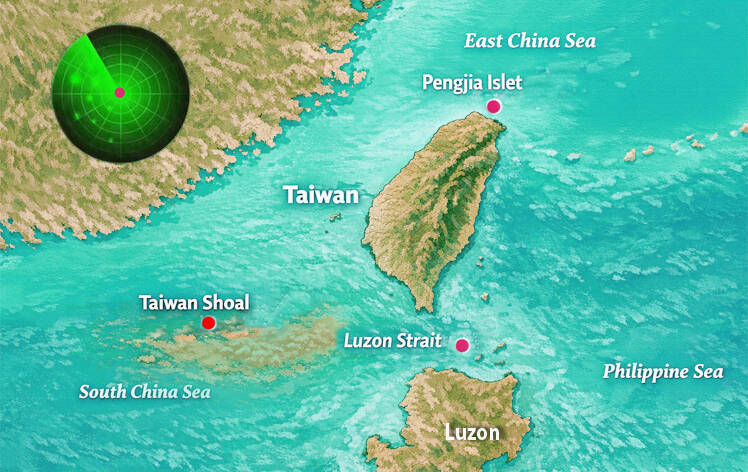 The network would expand the observation range to include blind spots in key strategic waters, with those near the Taiwan Shoal southwest of Penghu County, the Luzon Strait between Taiwan and the Philippines and Pengjia Islet being the priority, it said.
