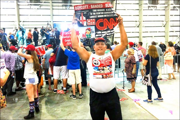 美國炸彈包裹案嫌犯薩尤科是川普鐵粉,自2016年開始經常出席川普造勢活動。圖為他在造勢場合上,高舉寫有「CNN爛透了」的標語。(取自紐約時報網站)