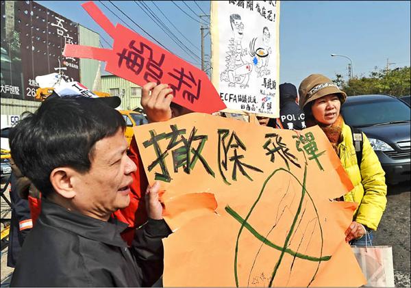 清泉崗機場周圍,有抗議民眾拿著要求撤除飛彈的海報向陳雲林嗆聲。(記者廖耀東攝)