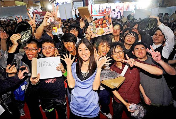 台北國際書展昨日持續在世貿展覽館舉行,「灼眼的夏娜」人氣聲優釘宮理惠(中)應邀來台舉辦簽名會,動漫迷為一睹本人風采,幾乎暴動。(記者方賓照攝)