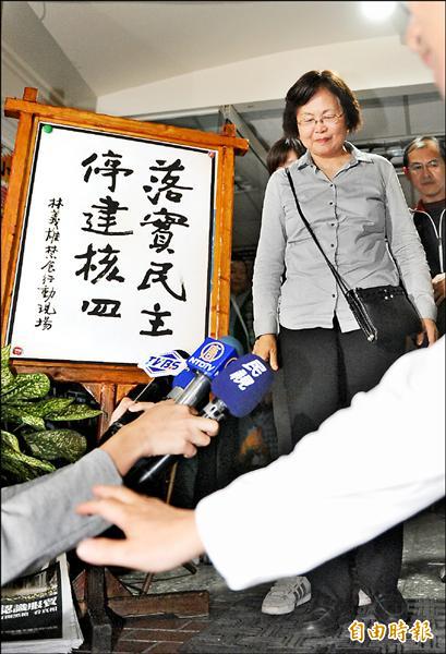 民進黨前主席林義雄為推動停建核四,昨起在義光教會展開無限期禁食,妻子方素敏昨晚前往關切後,低調離去。(記者劉信德攝)