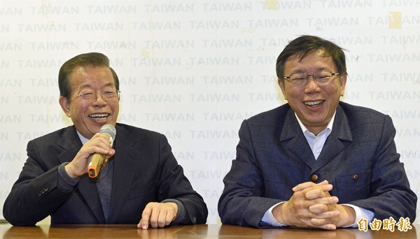 台北市長當選人柯文哲(右)、前行政院長謝長廷(左)。(記者陳志曲攝)