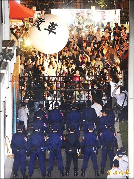 三一八學運昨滿週年,「經濟民主連合」等民團在立院外舉辦人民重返國會的晚會,並提出「憲政改革要啟動」等三大訴求;民眾還合力將寫著「憲政改革」的大球滾進立院,象徵「由下而上、啟動憲改」。(記者廖振輝攝)