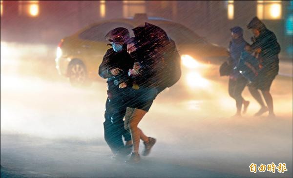 強颱杜鵑來襲,北市昨夜風雨加劇,強風吹得行人膽戰心驚。(記者林正堃攝)