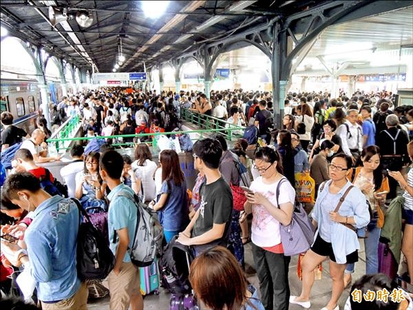 中秋連假最後一天遇上強颱杜鵑來襲,台中火車站內外擠滿人潮。(記者蔡淑媛攝)