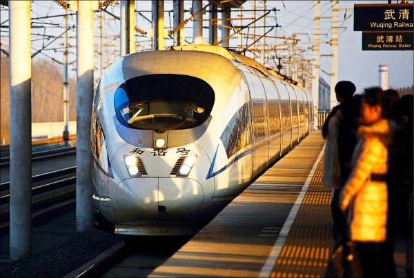 中國「十三五」規劃提出「京台高鐵計畫」,將北京通到福州的高鐵路線,再延伸到台灣,中國網友批提案是腦袋進水。圖為中國高鐵進站畫面。(彭博)