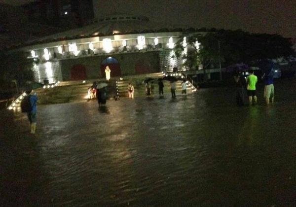 輔仁大學中美廣場積水嚴重。(圖擷取自輔仁大學學生會臉書)