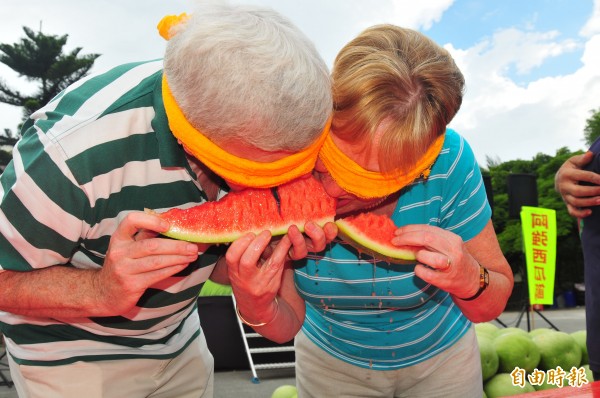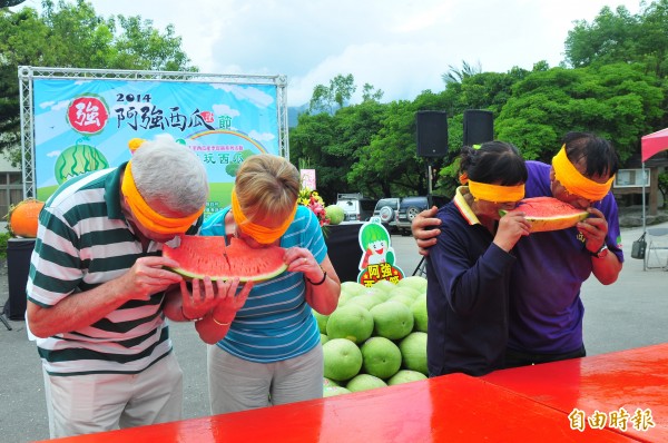 「西瓜很盲」!花蓮玉溪農會產銷班農民發起「阿強西瓜節」,今天舉行吃西瓜大賽之外,還有限定夫妻檔一起矇眼吃西瓜的「西瓜很盲」比賽,來自英國的威廉夫婦和女兒到花蓮玩,臨時上場參賽,顧不得英國淑女形象大口吞瓜,還意外獲勝、抱走一顆玉里大西瓜!