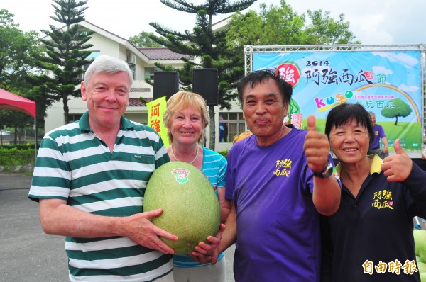 來自英國的喬治.威廉先生,和太太克利絲汀.威廉到亞洲旅遊,上週才結束香港行程,今天下午經過花蓮玉里鎮的玉溪農會推廣展售中心,看到正在辦西瓜節也下車看熱鬧,當場被拱上台參賽,和西瓜農羅榮廣夫婦一起站上「西瓜很盲」擂台,用毛巾矇眼合吃一片西瓜。