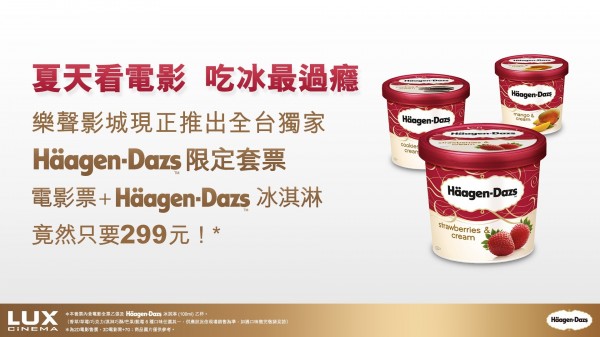 夏天看電影配冰淇淋比爆米花更過癮,台北市西門町樂聲影城推出限量夏季冰品套票組合,電影票加上哈根達斯冰淇淋只要299元,共有藍莓、草莓、巧克力、香草等6種口味可以選擇。