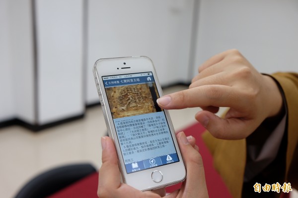 記者實際測試,靠近發射器後,該APP會自動呈現鄰近的展品選單,讓民眾選擇有興趣的展品進行內容瀏覽,還可將資料下載保存在手機裡,展出文物中還包括一株陶佛像搖錢樹,民眾在手機上搖晃,還可搖出驚喜,互動效果十分有趣。