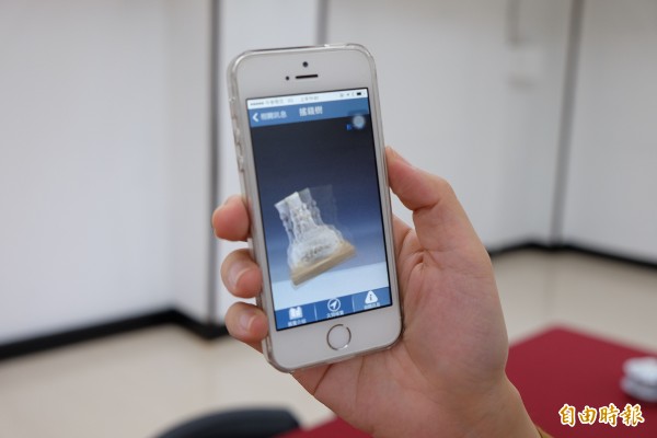 除了iBeacon近場感應導覽外,這次導覽App還加入手機互動元素,例如當走到「陶佛像搖錢樹」前,搖一搖手機,真會搖出驚喜。(記者陳炳宏攝)