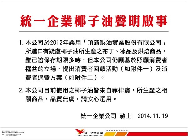 日前統一集團被爆出,前年使用頂新進口的飼料用椰子油製成布丁、麵包、冰品等共23項商品,統一提出補償方案,祭出「買一送二」的回饋。