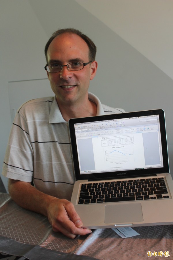 美國語言學博士白睿恩用筆電秀出他的博士論文研究,發現台灣講中文捲舌捲最好的不是外省籍的,反而是5年級後段到6年級前段班的台灣人。(記者黃美珠攝)