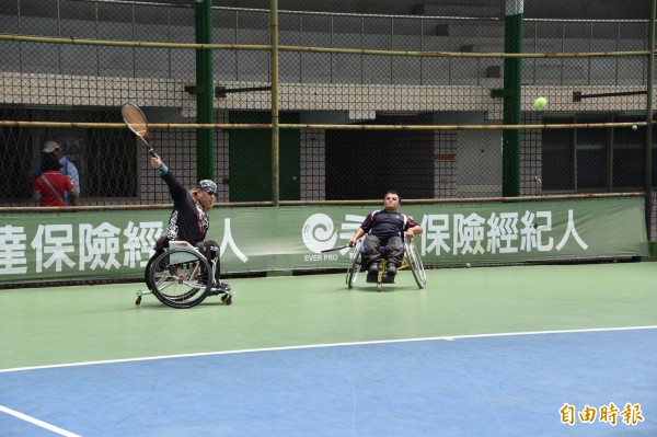 輪椅族朋友在全台首座身心障礙運動健康園區無障礙打網球。(記者蘇福男攝)